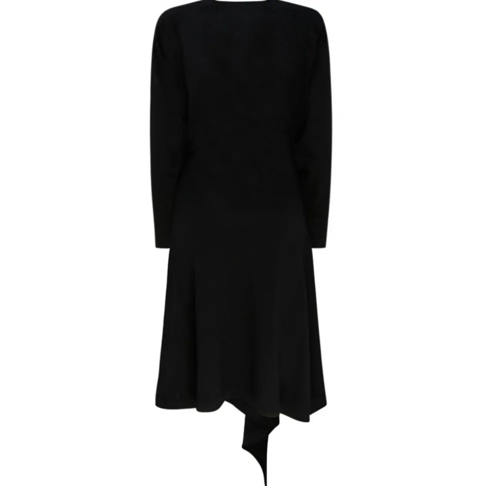 The Attico Black Wool Front Slit Long sleeved Wrap Dress. Black wool wrap dress, V-neck, side tie fastening, long sleeves, front slit, mid calf length, asymmetric hem.
