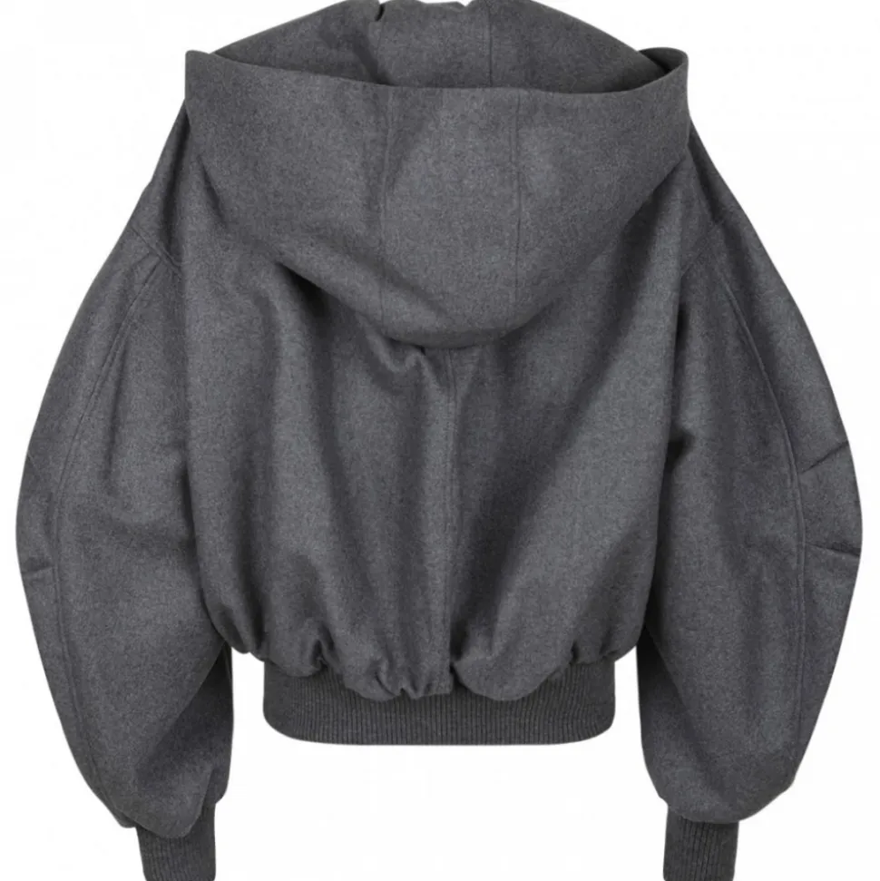 The Attico Grey Bomber Jacket. Grey wool blend bomber jacket, melange eggect, slouchy hood, front zip fastening. Branded zip puller, drop shoulder, long sleeves, ribbed cuffs. Two diagonal pockets to the sides, full lining, ribbed hem.