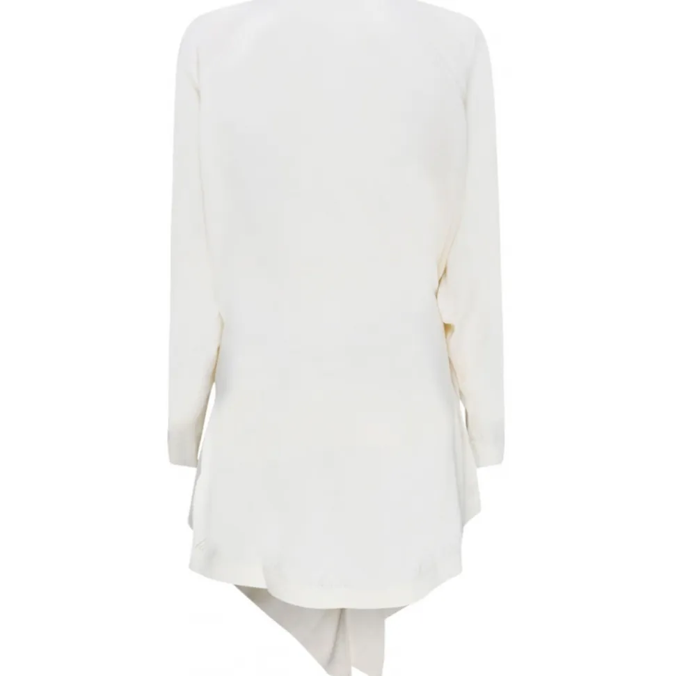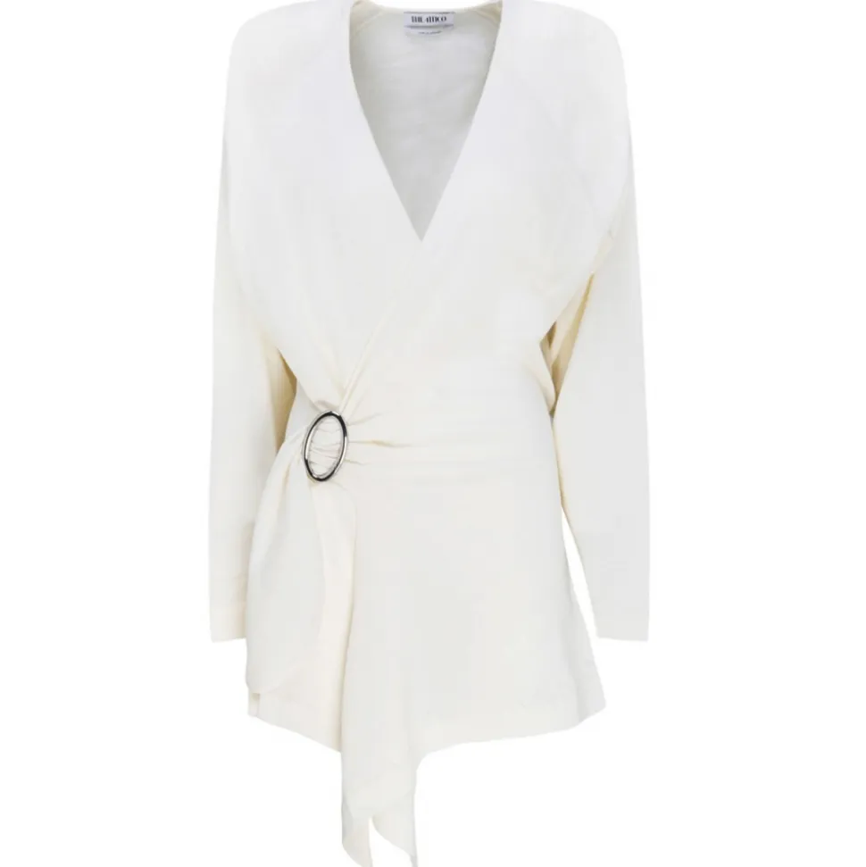 The Attico Ivory Wool Hurley Wrap Mini Dress. Ivory wool mini dress, wrap design, ring hardware detailing, V neck, long sleeves, buttoned cuffs, draped design and asymmetric hem.