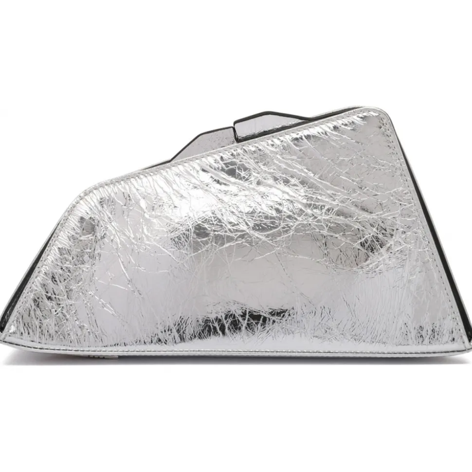 The Attico Silver 8.30 PM Clutch Bag. Silver oversized clutch bag in crackled silver laminated leather with magnetic closure.