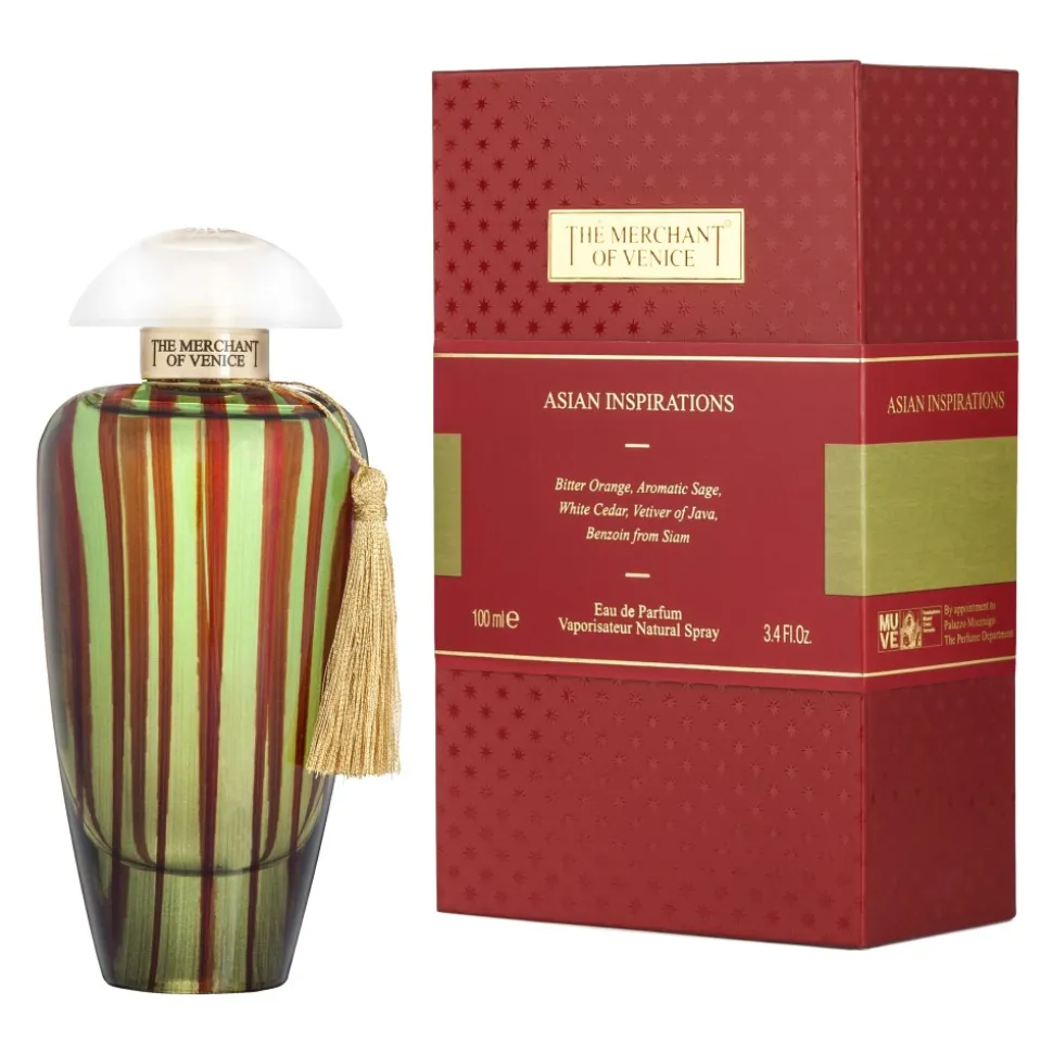 The fragrance Asian Inspiration is enclosed in an elegant green flacon that reinterpretes the classic asian style with a modern key. Its sober green and brown design recalls the precious raw materials componing the fragrance and transmits its strenght and refreshing effect. It is decorated with a golden tassel around its neck and others refinated details that recall the trading activity during la Serenissima.