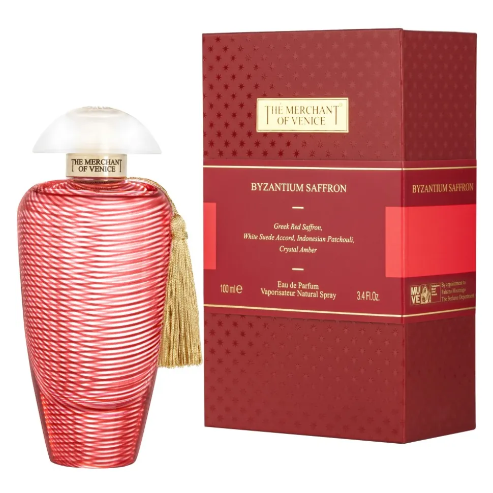 The fragrance Byzantium Saffron expresses its strength through a vibrant red flacon. The dazzling design gives the strong impression of the precious Saffron contained in the fragrance. It is decorated with a golden tassel and a white, semi-transparent cap through which we can view the wind rose.