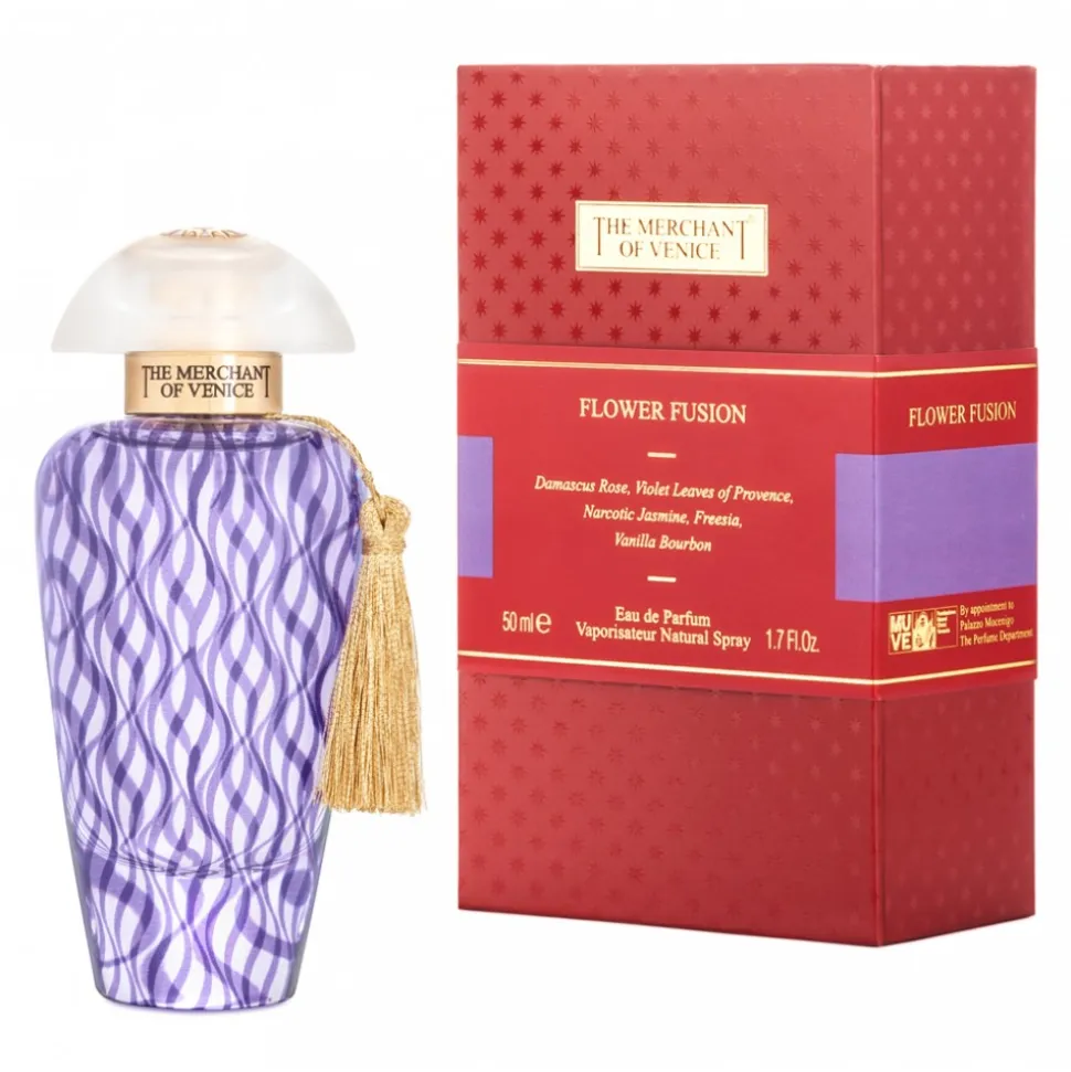 The shape of the flacon and the colour of Flower Fusion fragrance recalls the Murano glass manufacturing tradition and the violets of Provence contained in the fragrance. It is decorated with a golden tassel around its neck and an elegant white semi-transparent cap through which we can view the wind rose.