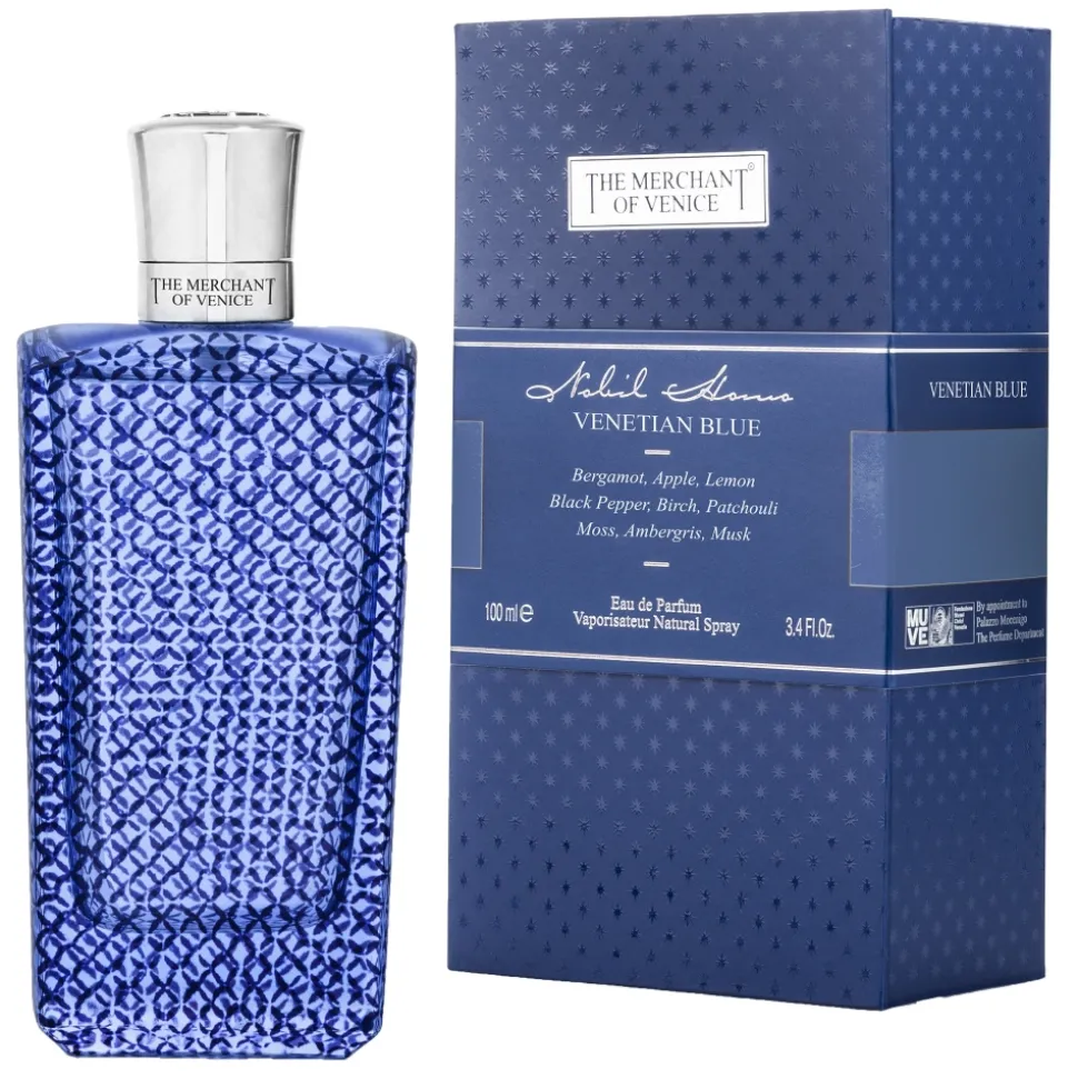 The fragrance Venetian Blue is enclosed in a stylish glass flacon with a blue pattern, recalling the old fabric manufacturing tradition of Venice and the colour of the sea. Its stylized rectangular shape together with the masculine blue tone match the masculine and the charismatic marine fragrance, based on a modern fougère structure, that it contains. It is further embellished with a silver cap that shows the wind rose.