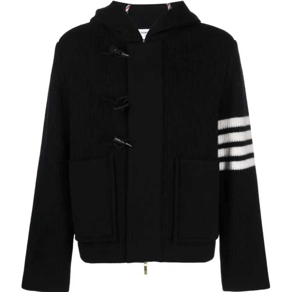 Thom Browne jacket man half cardigan stitch hooded duffle jacket in boiled wool w/ 4 bar stripe.