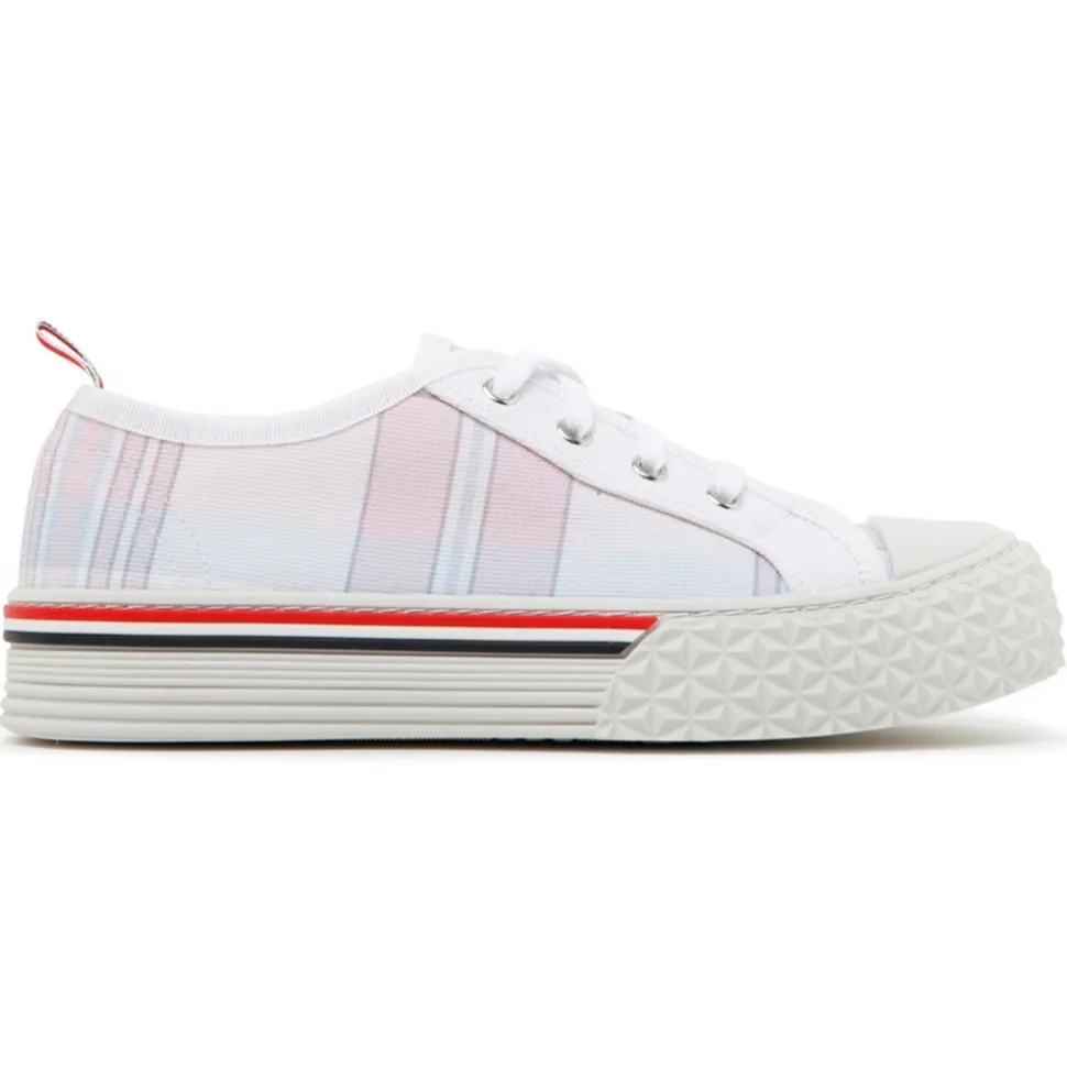 Thom Browne Madras Light Pink Canvas Collegiate Low Top Trainers. Light pink canvas low top trainers, check canvas with tartan textured, white front lace up fastening, logo flag at the tongue. Rubber cap toe, signature striped grosgrain loop tab at heel.