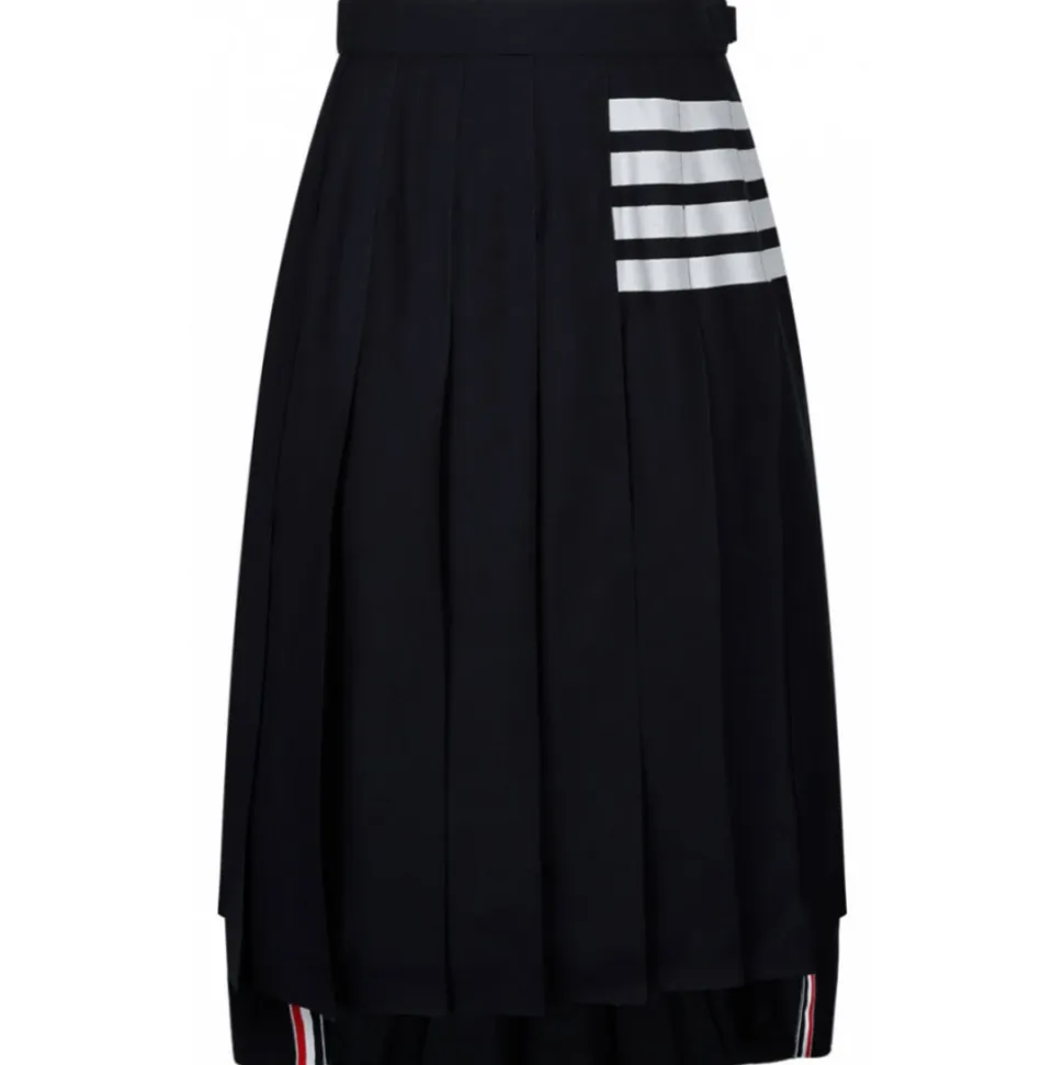 Thom Browne Navy Pleated Midi Skirt. Navy wool midi skirt, engineered 4-bar stripe detail, dropped back hem with signature striped grosgrain trim. Adjustable buttoned side tab closure, signature striped grosgrain loop tab at back waist.