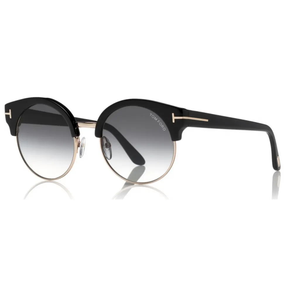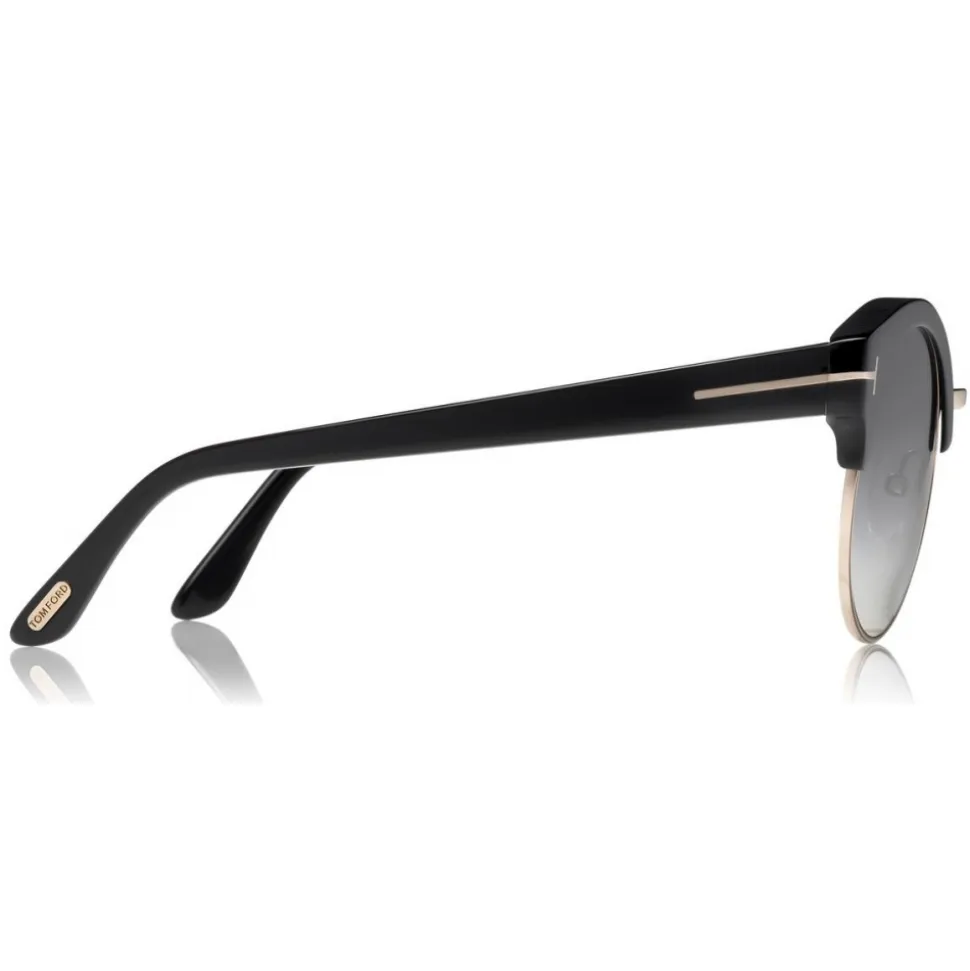 Shiny black acetate front and temple with shiny rose gold metal rims and T logo with gradient smoke lenses.