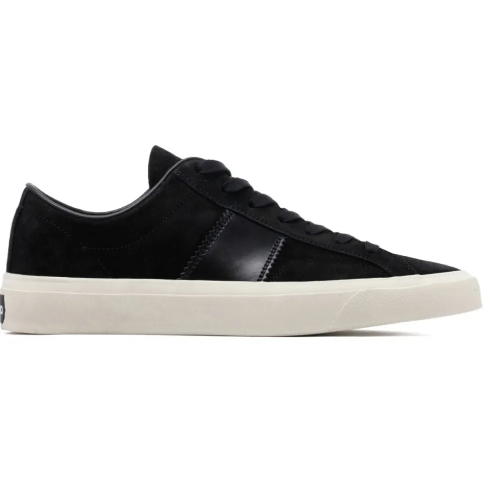 Tom Ford Black and Cream Logo Patch Sneakers. Black and cream calf suede and calf leather lace up sneakers, multi panel design, front lace up fastening. Round toe, branded heel counter, flat rubber sole.