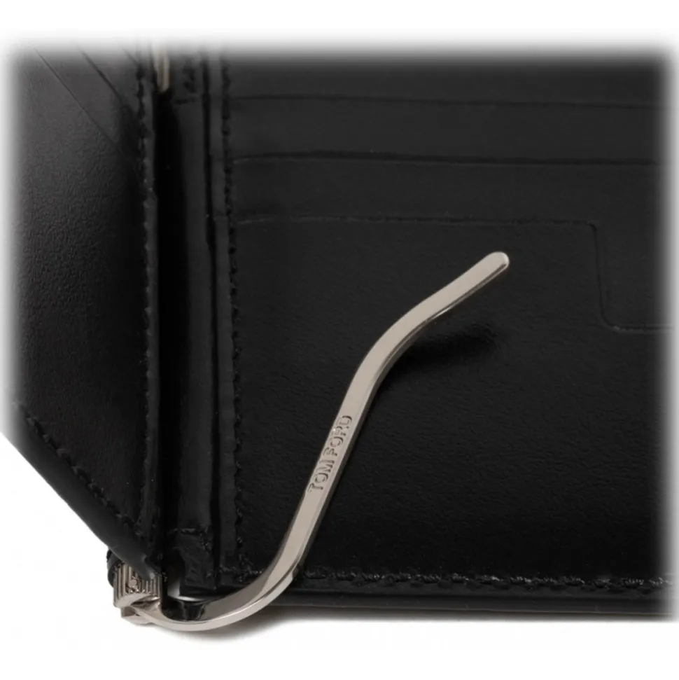 Tom Ford Black Calf Leather in Cocco Print Effect, printed logo in silver, 2 card slots and silver money clip on the back.