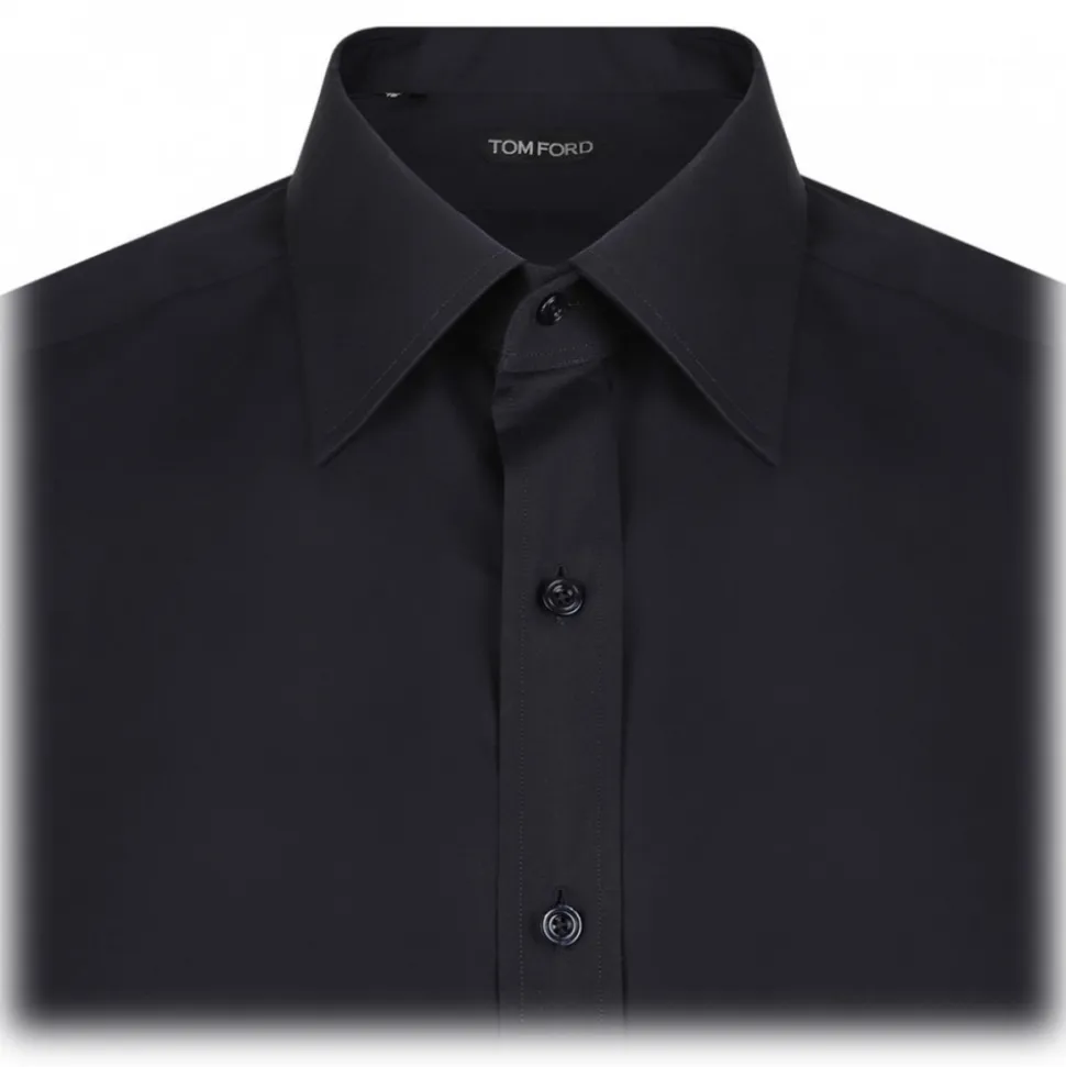 Tom Ford Black Classic Shirt. Black cotton shirt, poplin texture, classic collar, long sleeves. Buttoned cuffs, internal logo tag, curved hem and front button fastening.