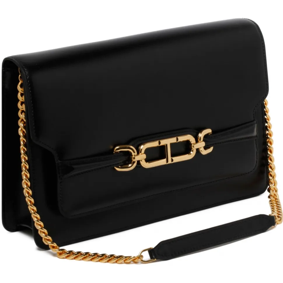 Tom Ford Black Medium Whitney Shoulder Bag. Black calf leather shoulder bag, gold tone logo plaque, foldover top with magnetic fastening. Leather and chain link shoulder strap, slip pocket to the front. Main compartment, internal logo stamp, internal slip pocket, leather lining, gold tone hardware.