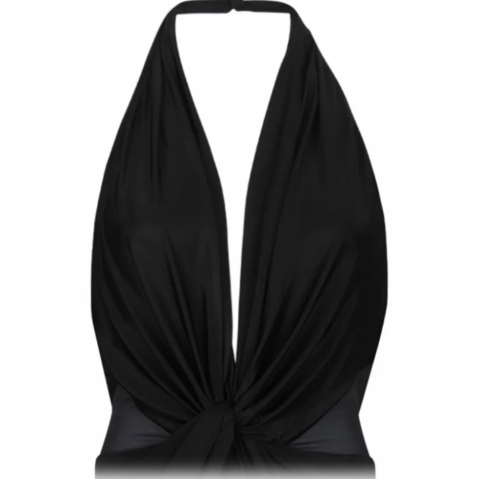 Tom Ford Black Sheer Maxi Dress. Black texture finish maxi dress, halterneck, knot detailing. Semi sheer panels, open back, long length, straight hem, rear hook and eye fastening.