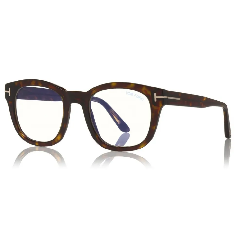 Discover the latest ready-to-wear clear lenses now available in TOM FORD Eyewear. These protective lenses reduce risks of blue lights and increase visual comfort from long exposure to digital devices. Soft squared acetate style with metal ‘T’ temple decoration.