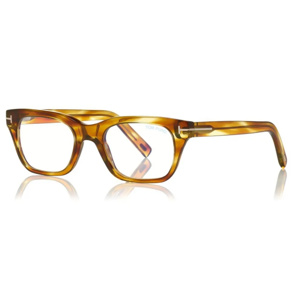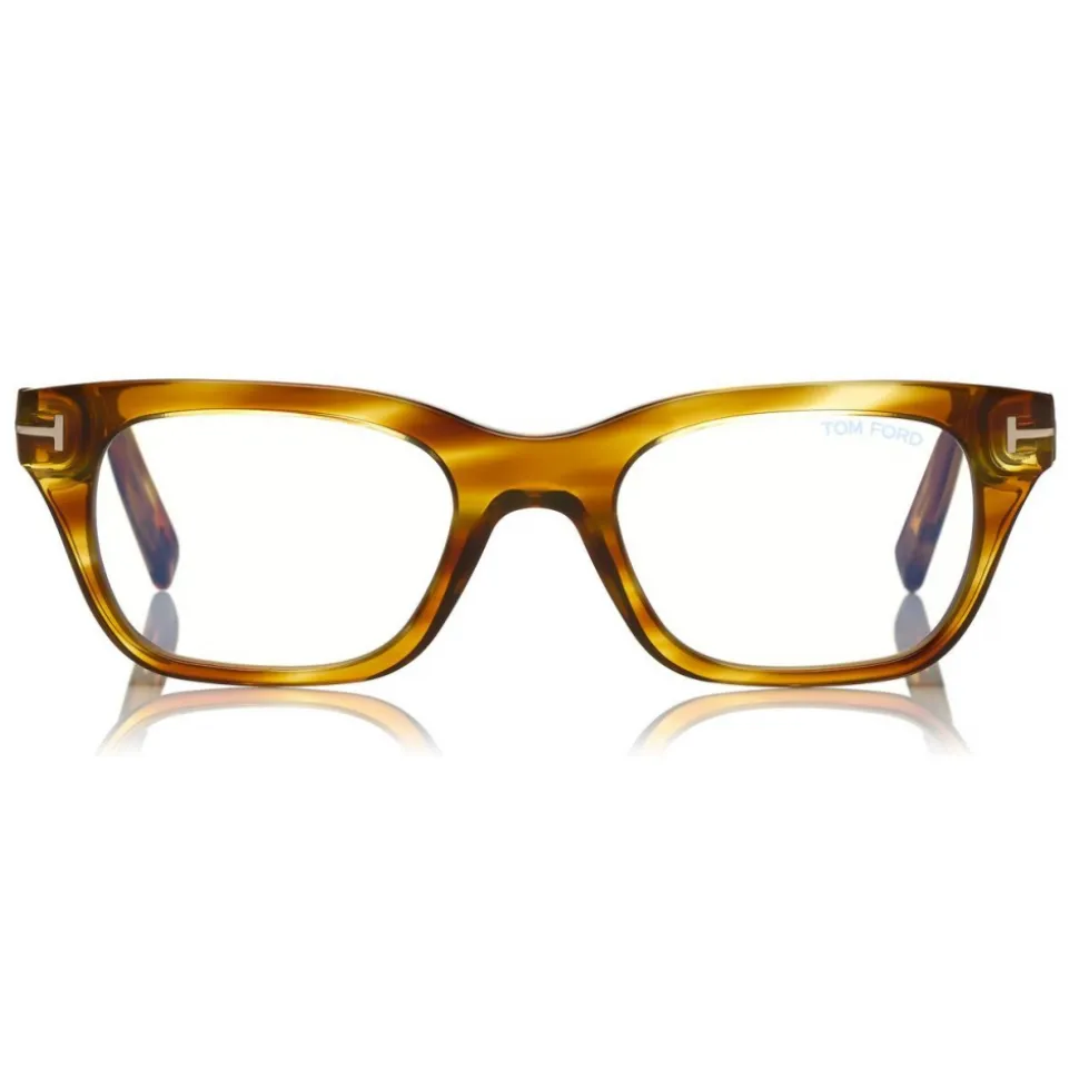 Discover the latest ready-to-wear clear lenses now available in TOM FORD Eyewear. These protective lenses reduce risks of blue lights and increase visual comfort from long exposure to digital devices. Soft squared acetate style enriched by metal T logo decoration.