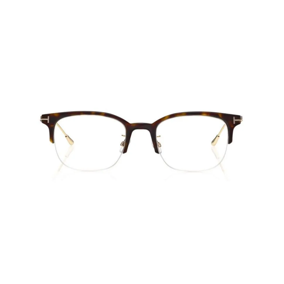Browline style characterized by a semi-rimless front and metal temple tips, with metal “T” logo decoration.