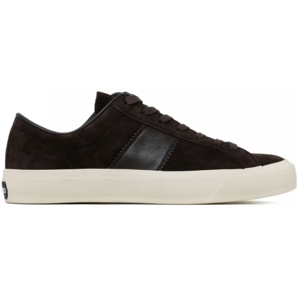 Tom Ford Brown and Cream Low Top Sneakers. Brown and cream calf suede and calf leather sneakers, panelled design, branded heel counter. Round toe, front lace up fastening, flat rubber sole.