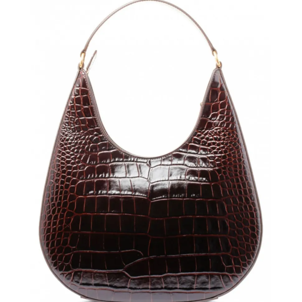 Tom Ford Brown Shoulder Bag. Brown embossed crocodile effect shoulder bag, curve edge body, single flat top handle. Logo plaque, main compartment, internal logo stamp, internal patch pocket. Canvas lining, gold tone hardware, top zip fastening.