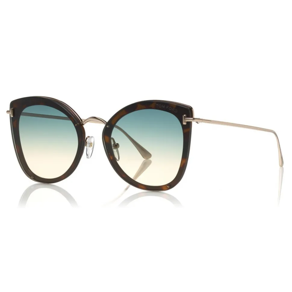 Soft butterfly style. A combination between acetate and metal, where the acetate disappears behind the lenses. The metal T logo decoration is set on the lens. Adjustable nose pads.