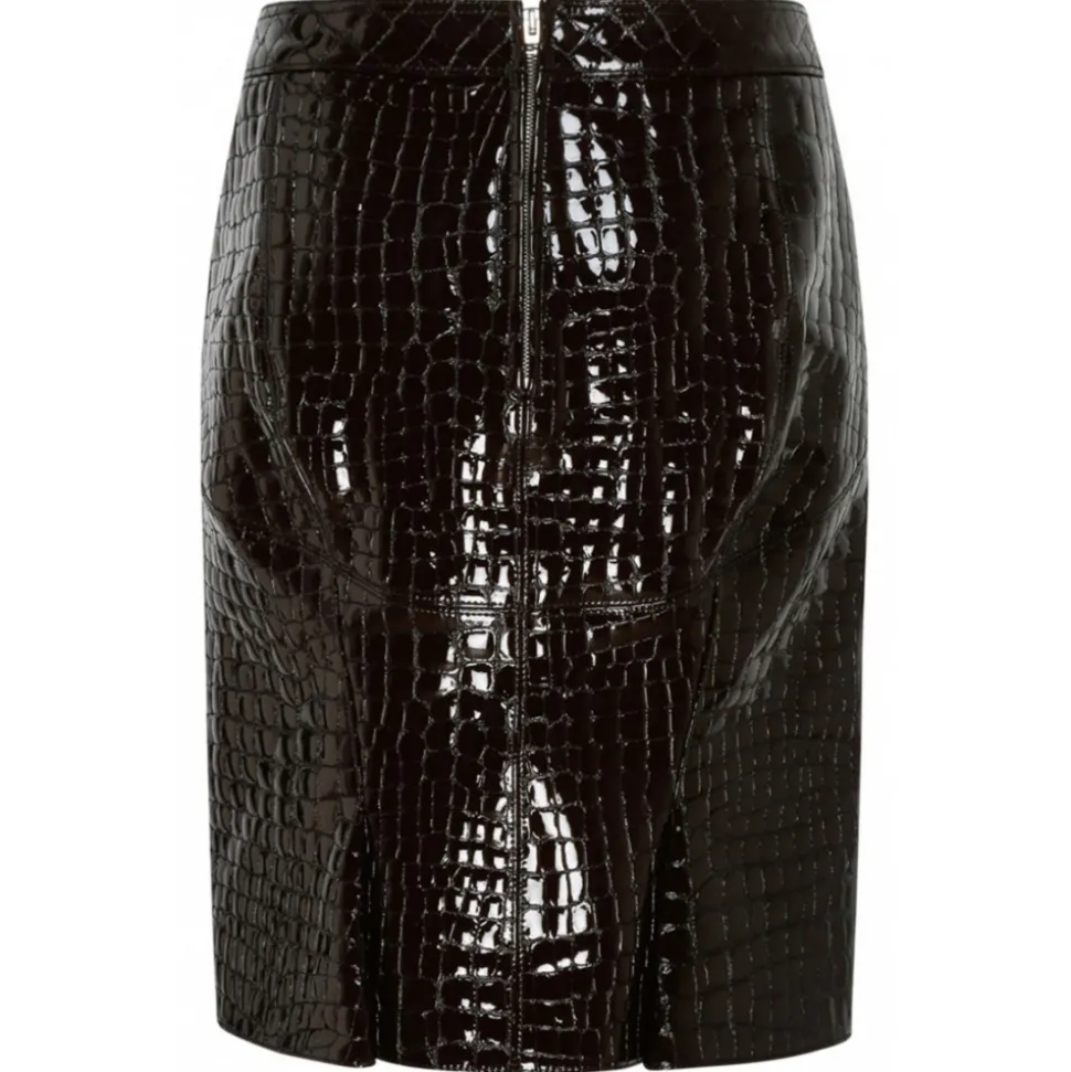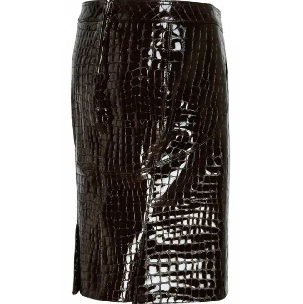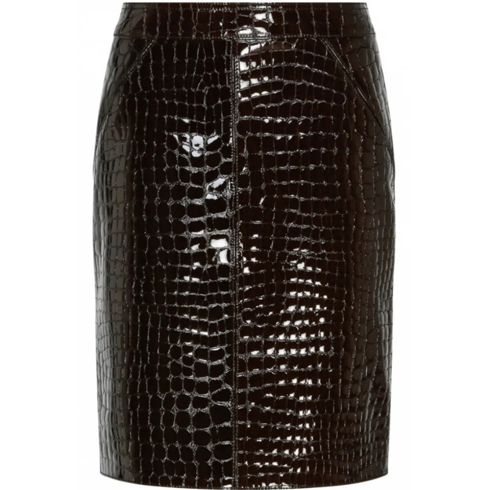 Tom Ford Dark Chocolate Glossy Skirt. Dark chocolate glossy Croco embossed goat leather skirt, front sainted pockets, pleated back hem, centre back zip, fully lined.