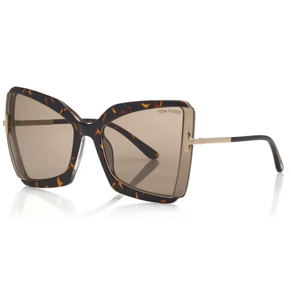 Butterfly acetate shape with geometrical metal temple which creates an extra bold ‘T’ logo decoration above the lenses.