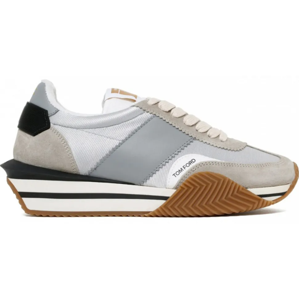 Tom Ford James Chunky Platform Sneakers. Silver tone and taupe brown calf leather sneakers, suede panels, micro mesh panels. Logo patch at the tongue, logo print to the side, contrasting branded heel counter. Front lace up fastening, almond toe, branded insole, platform wedge and chunky rubber sole.