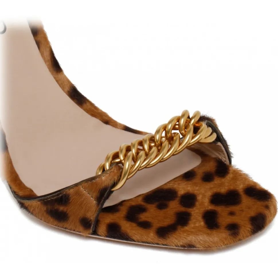 Tom Ford Leopard Print Sandal. Leopard print calf hair and leather zenith sandal, square toe shape, 10,5 cm Stiletto heel. Gourmette chain detail, TF charm, buckle fastening ankle strap.