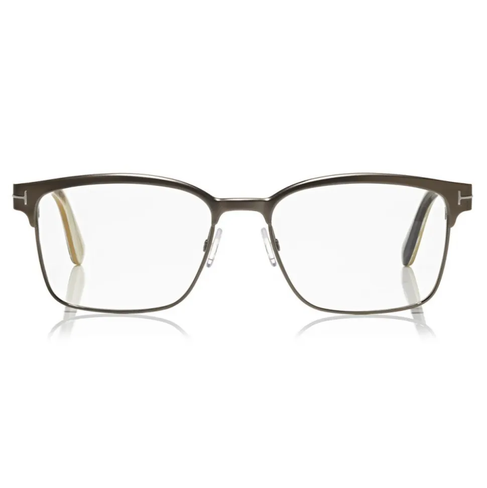 Shiny gunmetal metal front and shiny horn acetate temples with shiny gunmetal T logo.