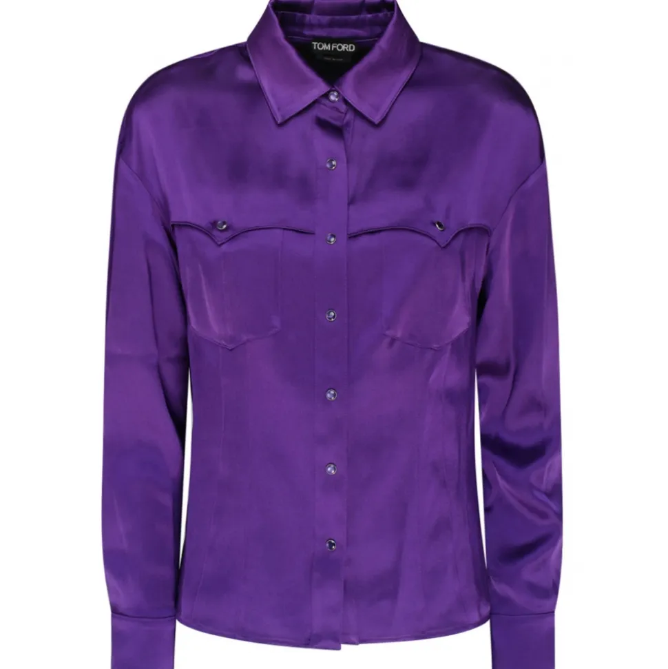 Tom Ford Purple Satin Western Style Shirt. Purple satin shirt, Western style, classic collar. Front press stud fastening, two chest flap pockets, long sleeves, buttoned cuffs and straight hem.