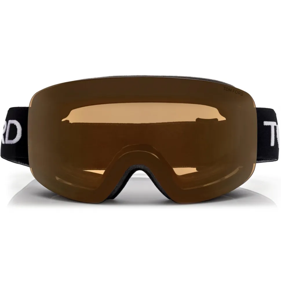 Ski goggle with sporty details and technical features. The black adjustable elastic strap boasts tom ford signature in a white vintage look. Interchangeable lenses in flesh silver and photochromatic bronze..