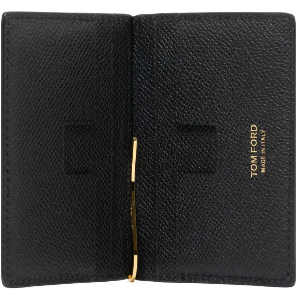 Tom Ford T Line Folding Money Clip Card Holder with one external and four internal card slots, money clip with TF engraved logo and TF gold hardware details.