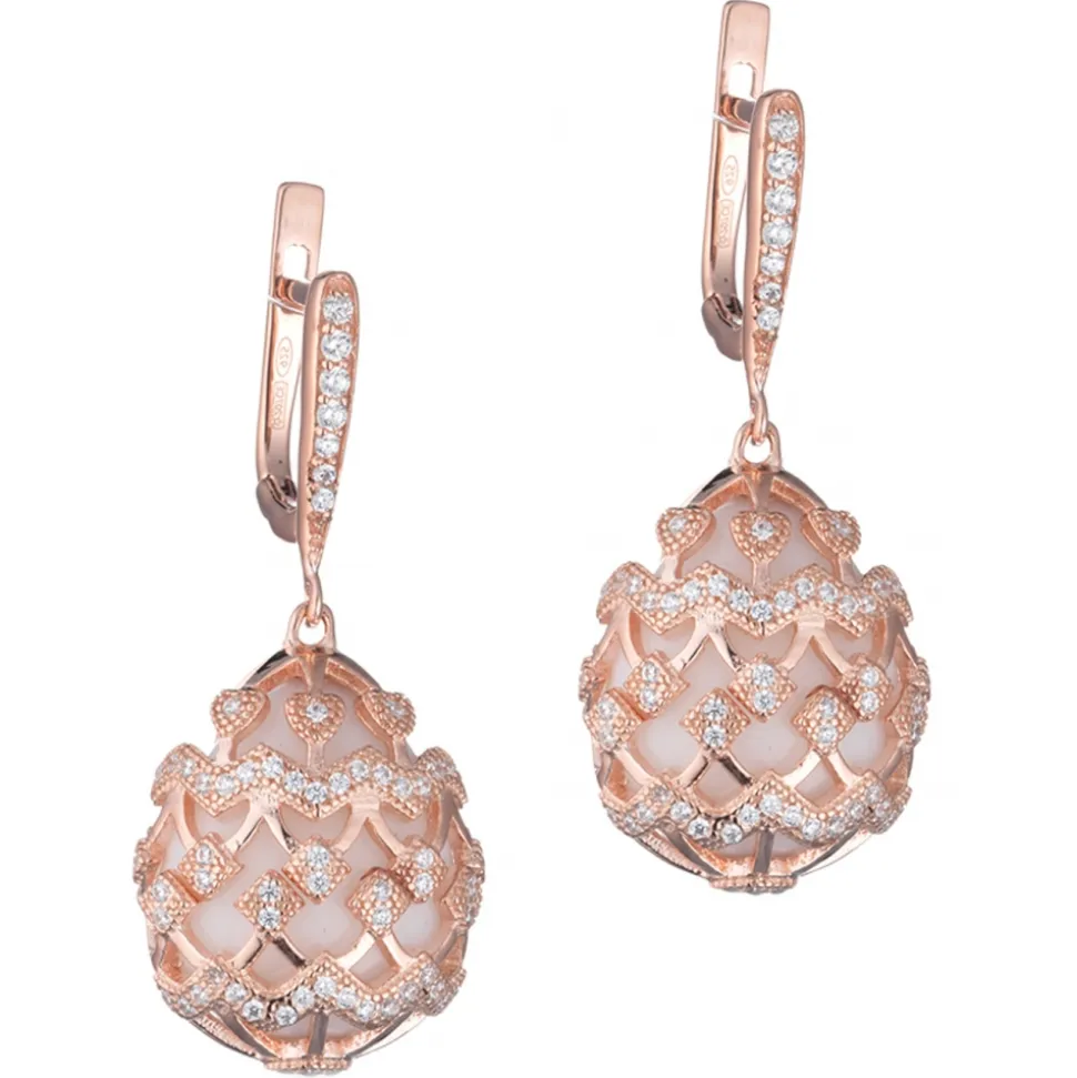 Precious white agate earrings with arabesque motif cubic zirconia cage.