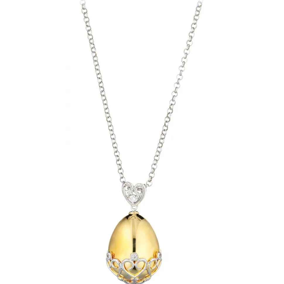 Necklace in yellow gold and 18 kt white gold. Egg-shaped pendant in yellow gold enclosed by heart decorations in white gold. The decoration is embellished with 14 white diamonds for a total of 0.12 ct.