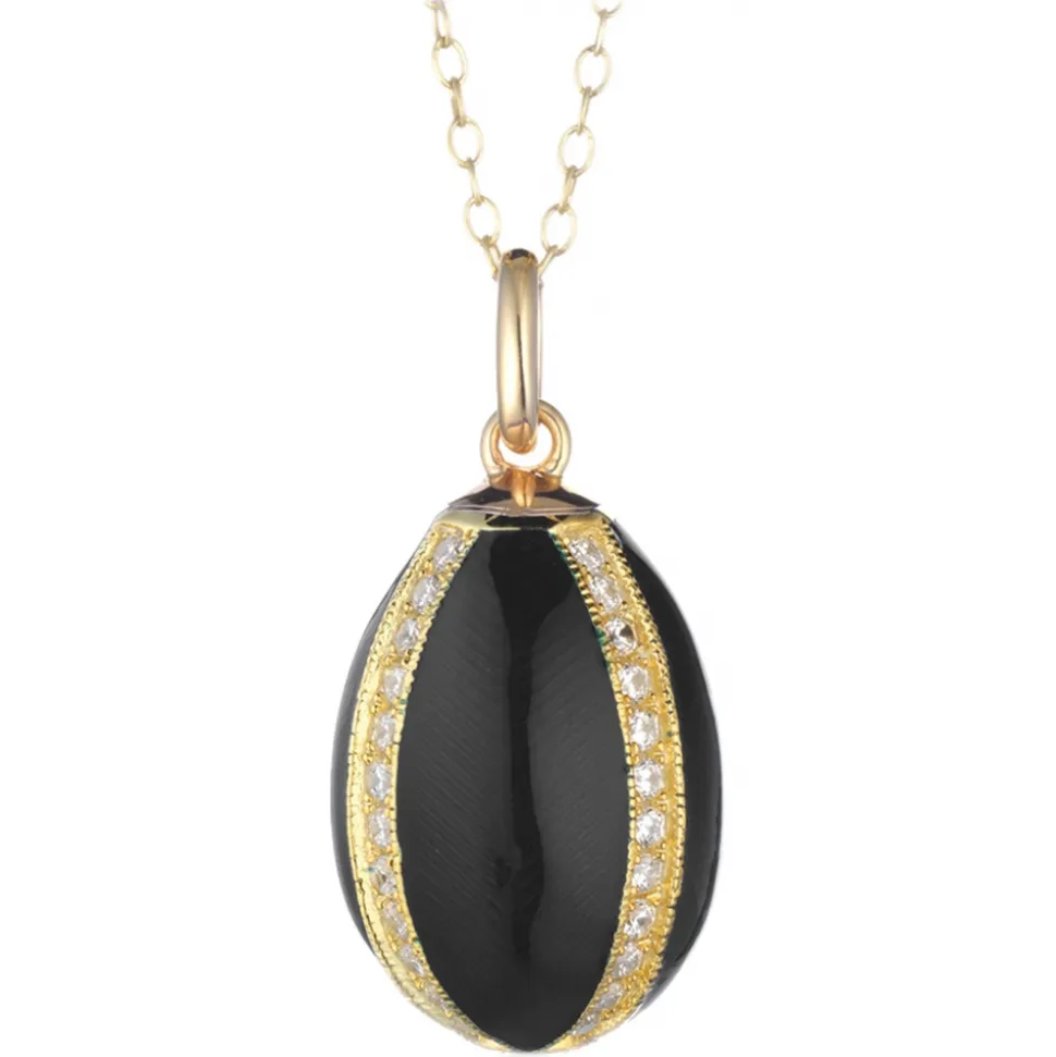 Necklace in 925 gilded silver with egg-shaped pendant with guilloché work and finished with black enamel, decorated with four symmetrical silver bands studded with zircons, creating four sections.