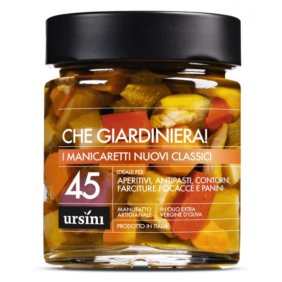 Mix of vegetables in extra virgin olive oil. The particularity of this Giardiniera is that each ingredient is cooked in different ways depending on its size and its fragility. Moreover, we have added more ingredients and spices, having as result an extraordinary Giardiniera, really different from the conventional ones. Che Giardiniera is scented, crunchy, fragrant, balanced and tasty. Perfect as sidedish, really nices as aperitif or to fill panini.
