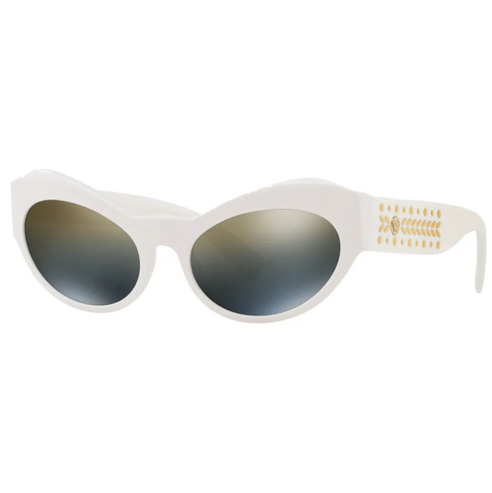 Without ever being afraid to stop and stare, the woman who wears these cat eye sunglasses in acetate always draws attention. With thick white frames, shaded mirrored lenses and temples decorated with light-gold Medusa studs in the shape of leaves.