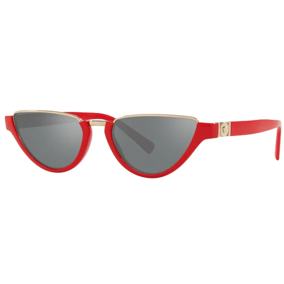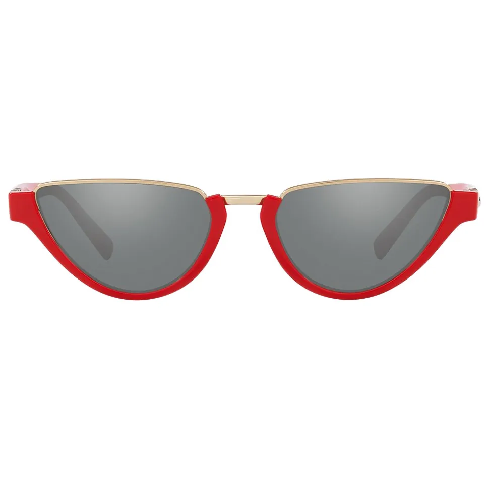 Distinctive cut-off frame sunglasses featuring a red frame and grey lenses. Embellished with a gold-tone Medusa detail.