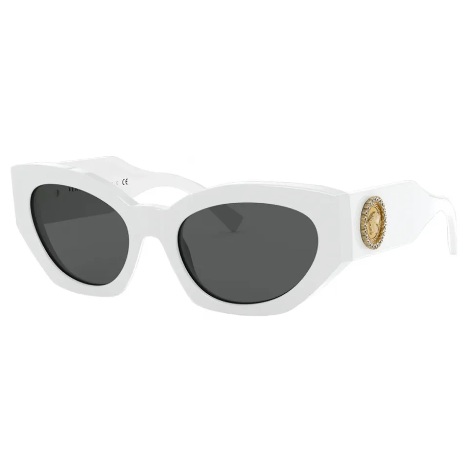 White sunglasses boasting a modern, thick acetate frame in an irregular shape. The temples are enriched with a Medusa encircled by crystals.