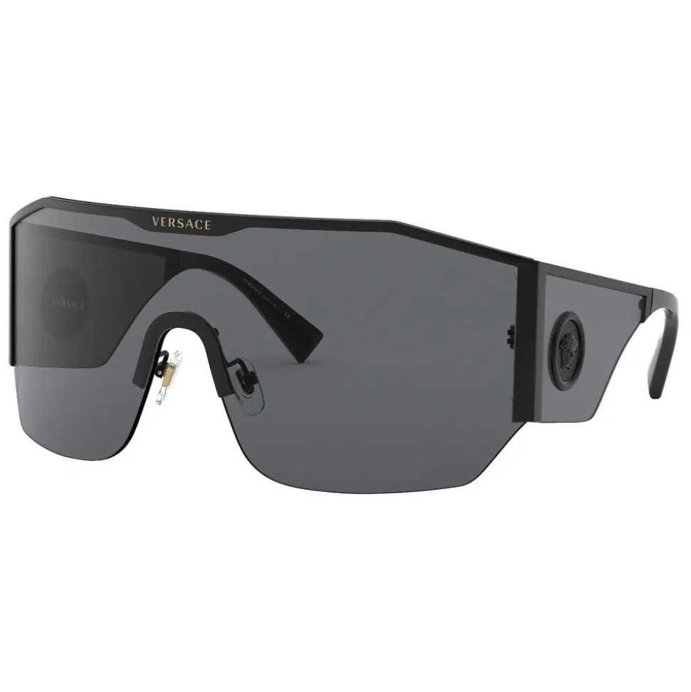 Contemporary shield sunglasses with a dynamic flat wrap cylindrical shield lens and flat metal top rim. The black style features ultra-wide temples embellished with a ton-sur-ton Medusa Halo emblem.