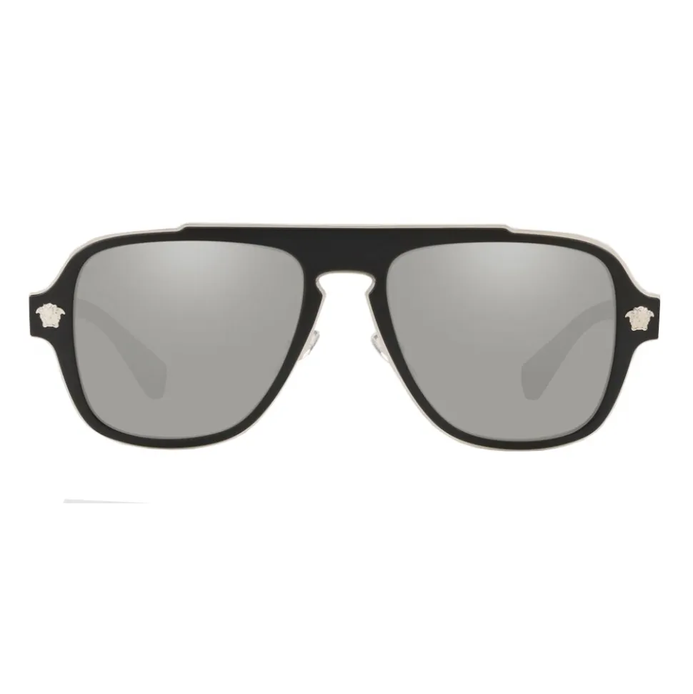 Retro–inspired, yet very contemporary, these pilot shaped sunglasses feature an elegant matte black frame paired with mirrored grey lenses. Enriched with silver tone hardware – Medusa studs and logo on the temples.