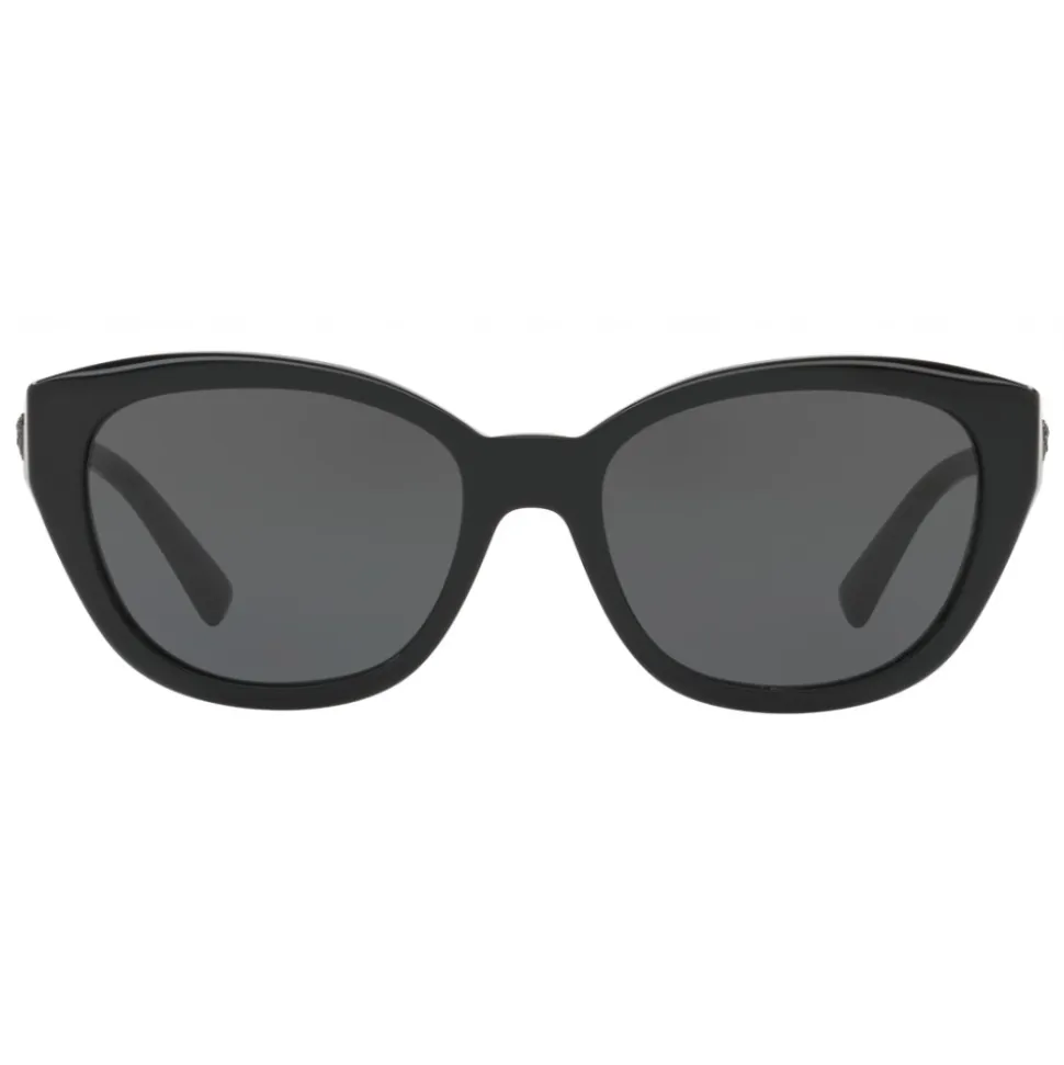 Cat-eyed sunglasses with black frame, gray lenses, jet black details and three lateral Medusa heads.