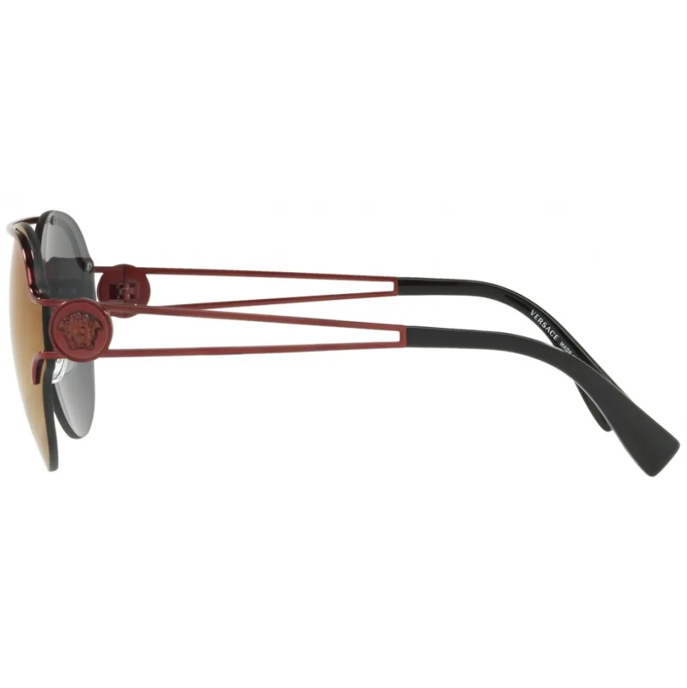 The V-Powerful round rimless sunglasses embody the poster. Mirror bordeaux lenses, frame and bordeaux rods with black terminals and Medusa heads that highlight the aesthetics.