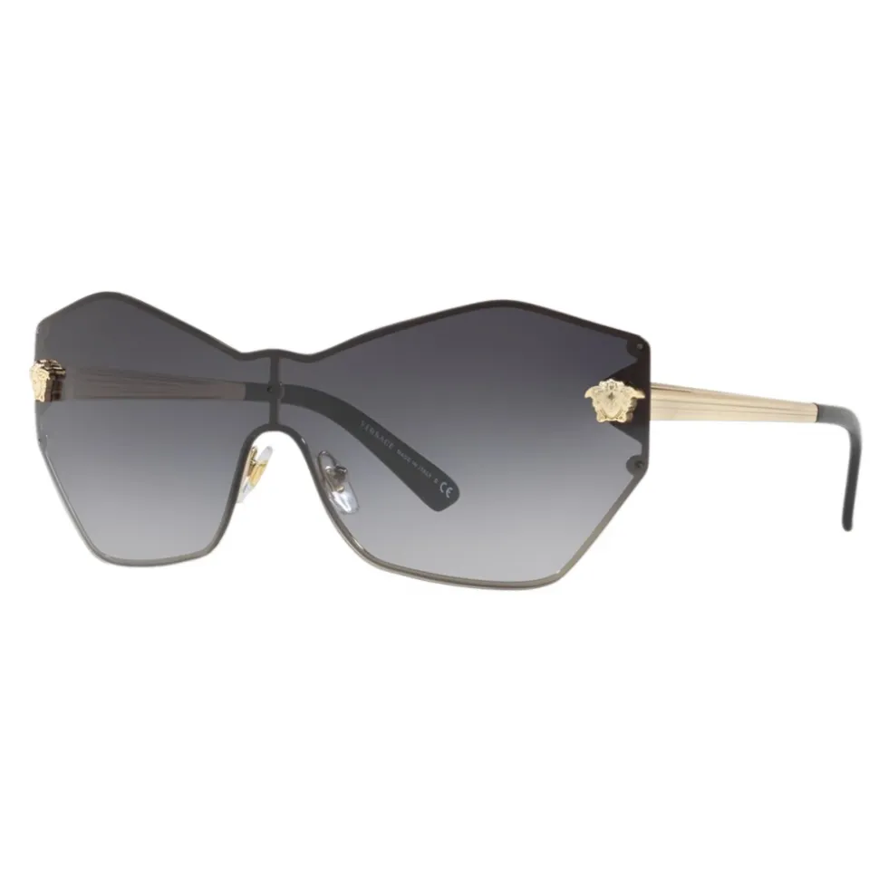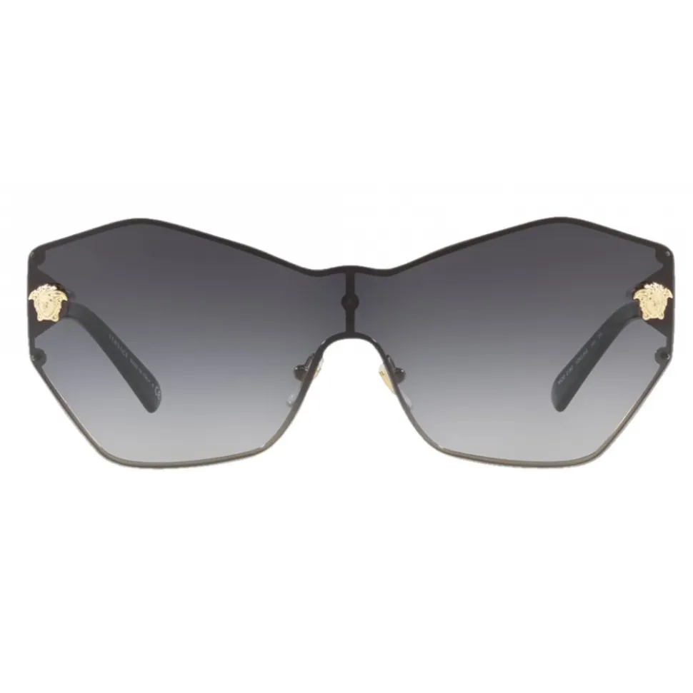 Elegant and futuristic sunglasses with a shield lens shape in a cool grey tone. Enriched with two pale gold tone Medusa studs.
