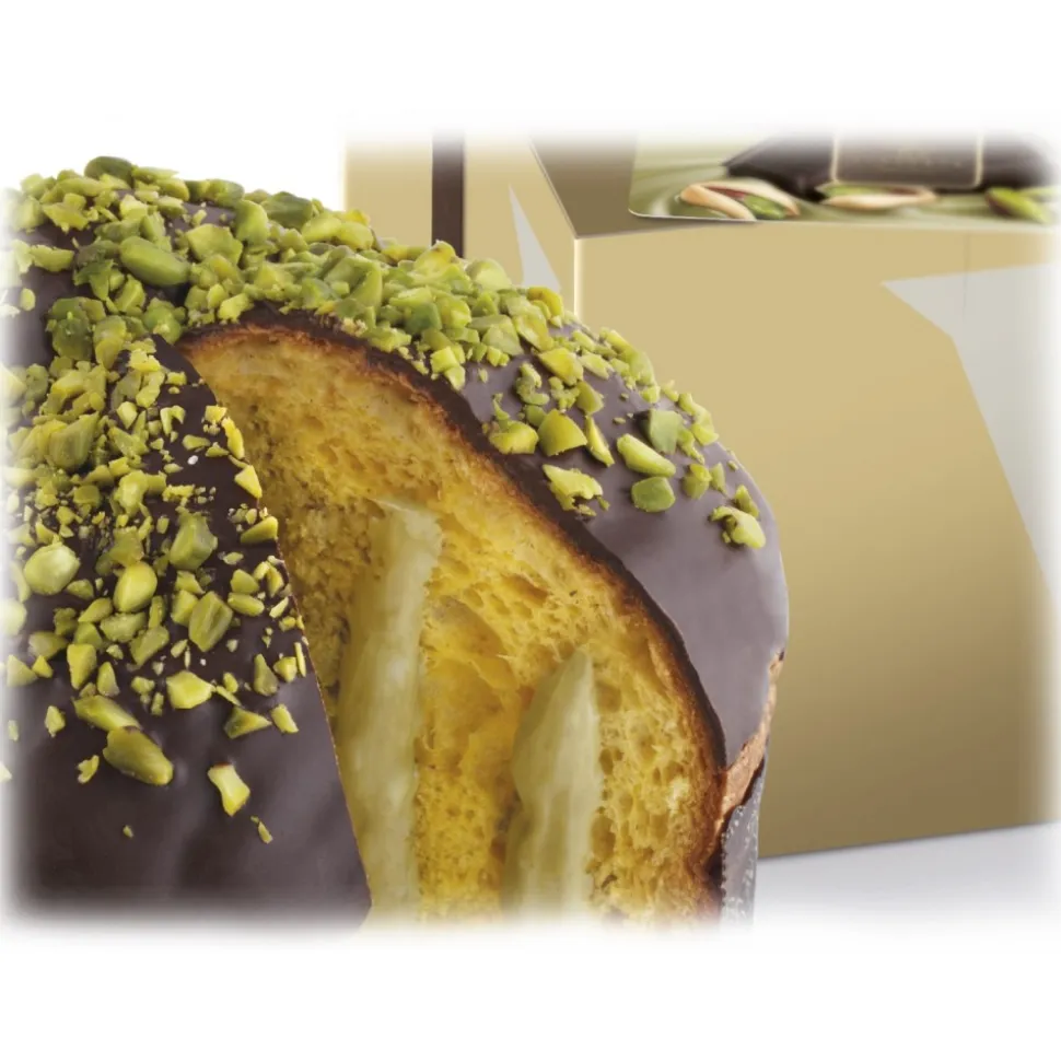 Panettone Coated with Dark Chocolate and Sicilian Pistachio Stuffed with Pistachio Cream