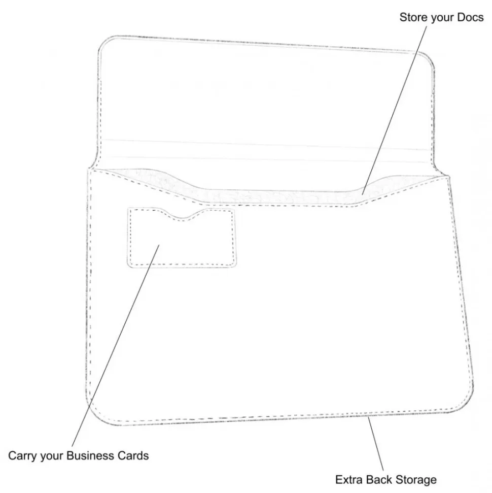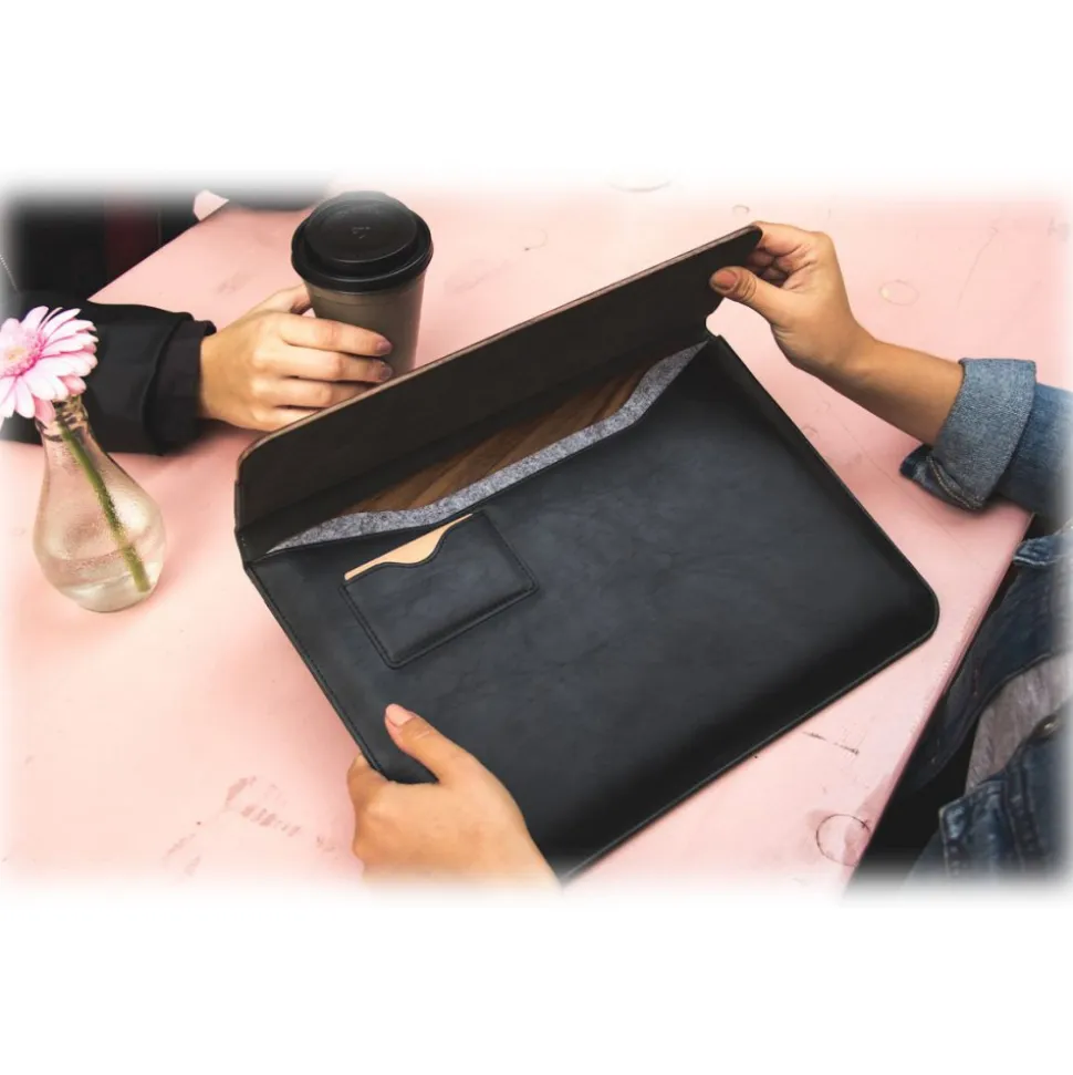 Additional pockets inside and a slot on the outside offer space for important documents. You can organize your MacBook and other important stuff all in one. Underneath the flap you can store your business- or credit cards.