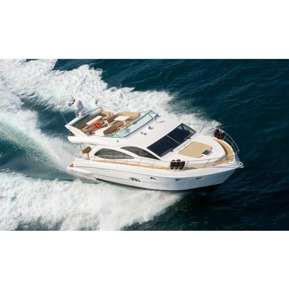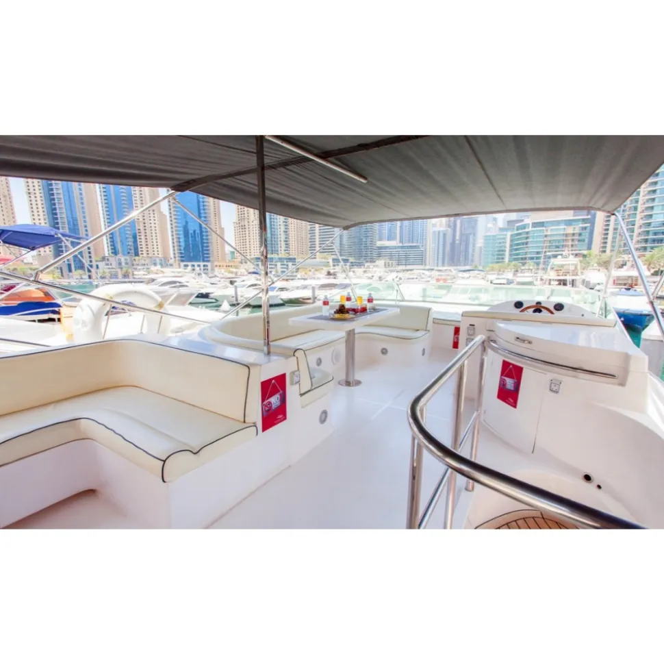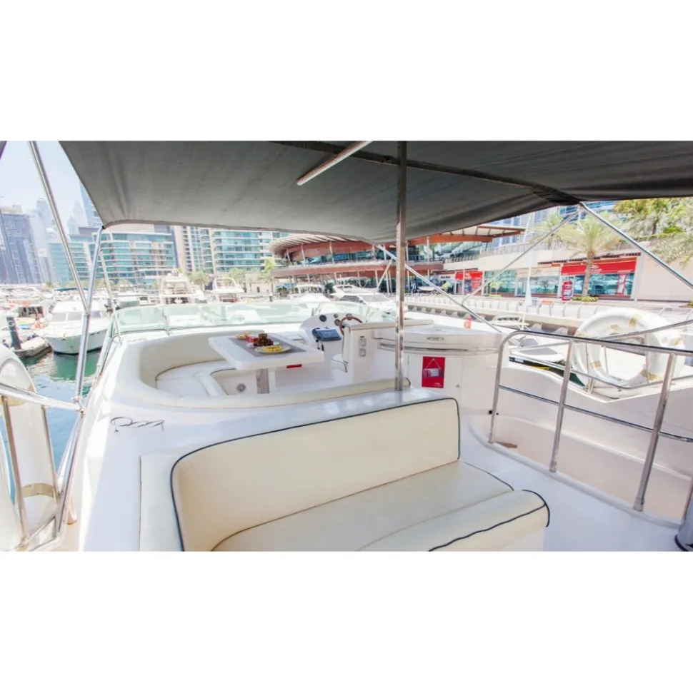 If you want to cruise the waters of Dubai in absolute comfort then Majesty 56 is the right choice for you. The yacht is large enough to cater for up 20 guests during the day and has 3 cabins. It has a very spacious living area with comfortable seating and a separate dining area as well. the main attraction of this yacht is the large fly bridge area with ample seating and a upgraded bose sound system. Tastefully decorated and equipped to a very high standard you can be sure of a memorable charter experience on our Majesty 56.