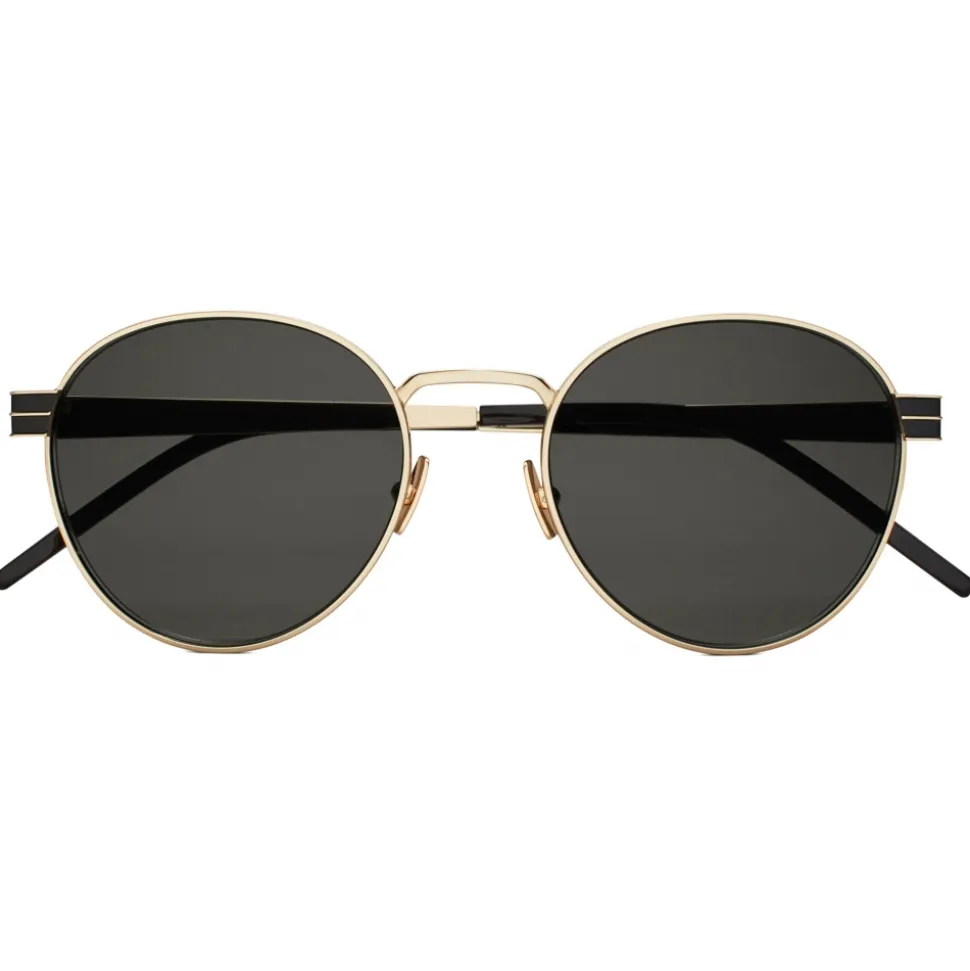 Sunglasses with rounded frames and nylon lenses, featuring metal and enamel temples decorated with YSL initials.